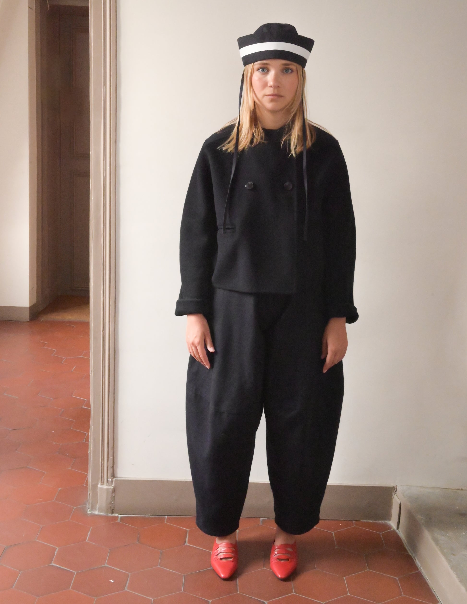 Chapeau marin couleur bleu marine avec ruban blanc.