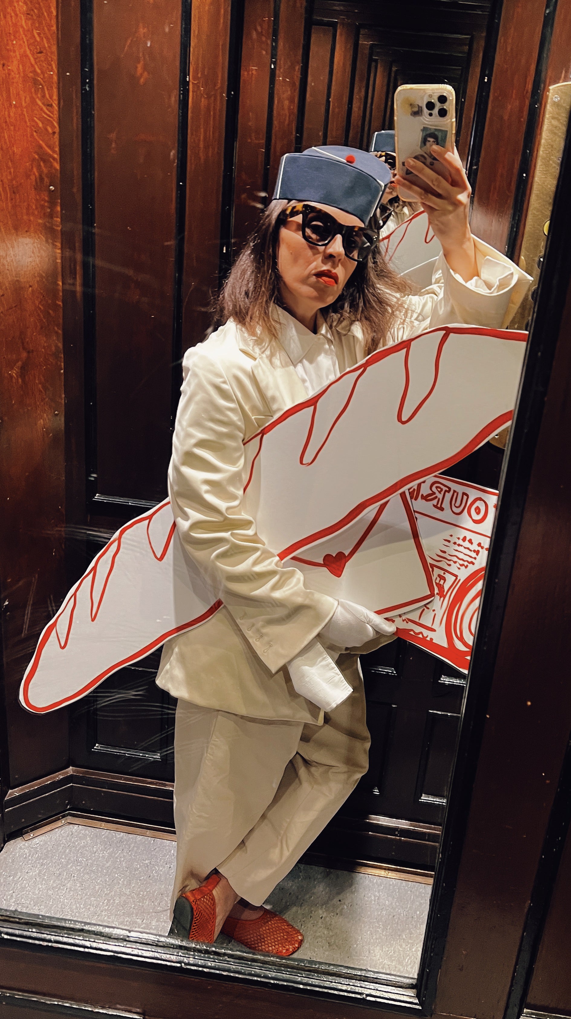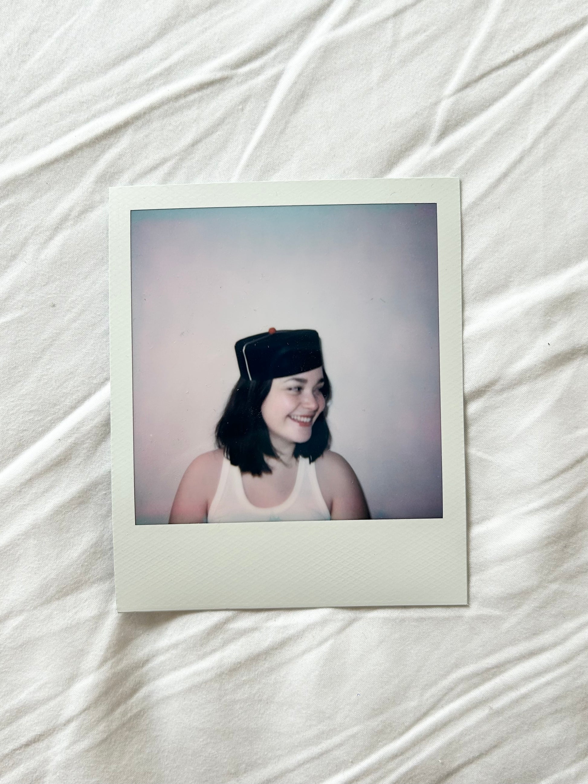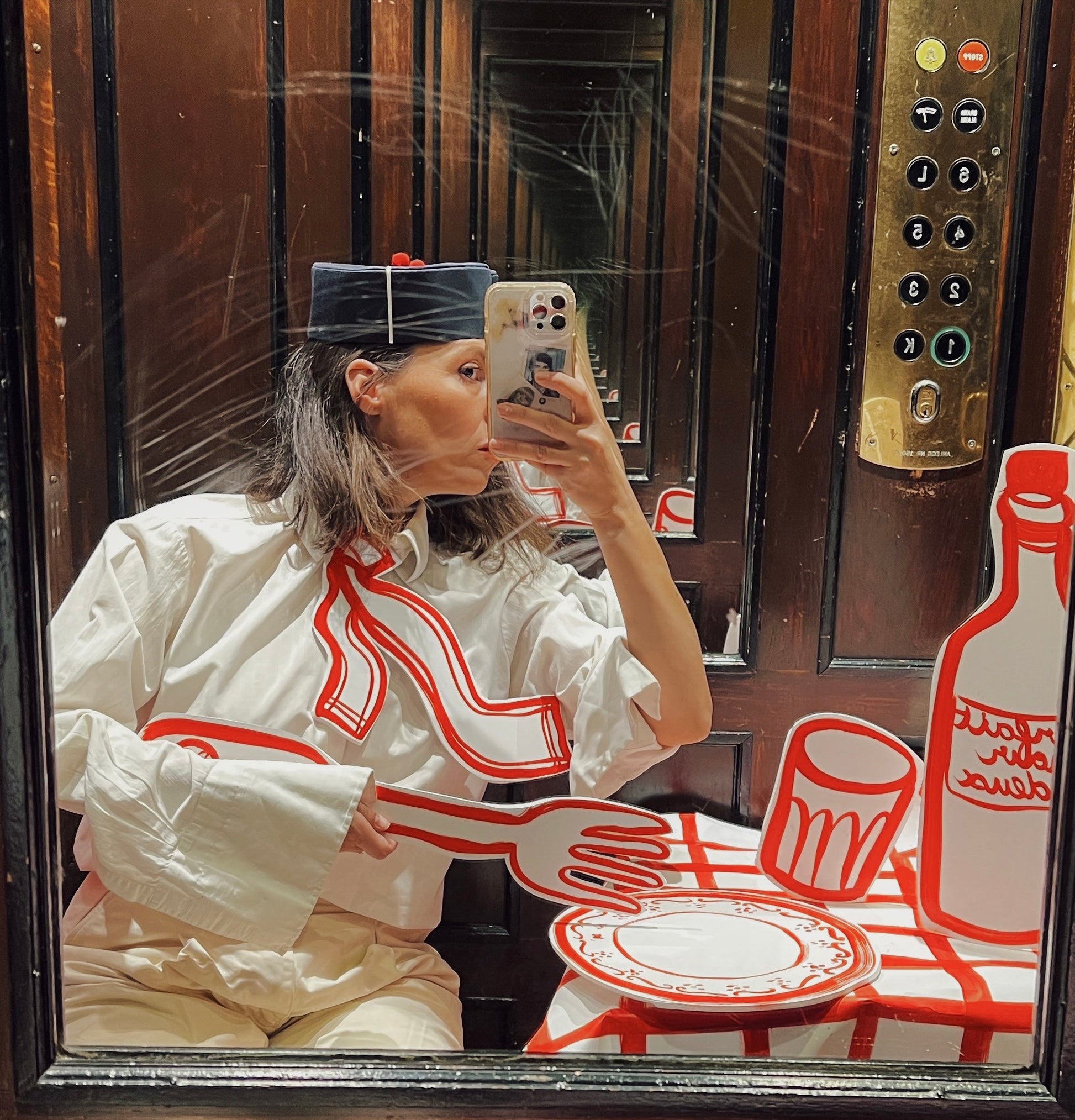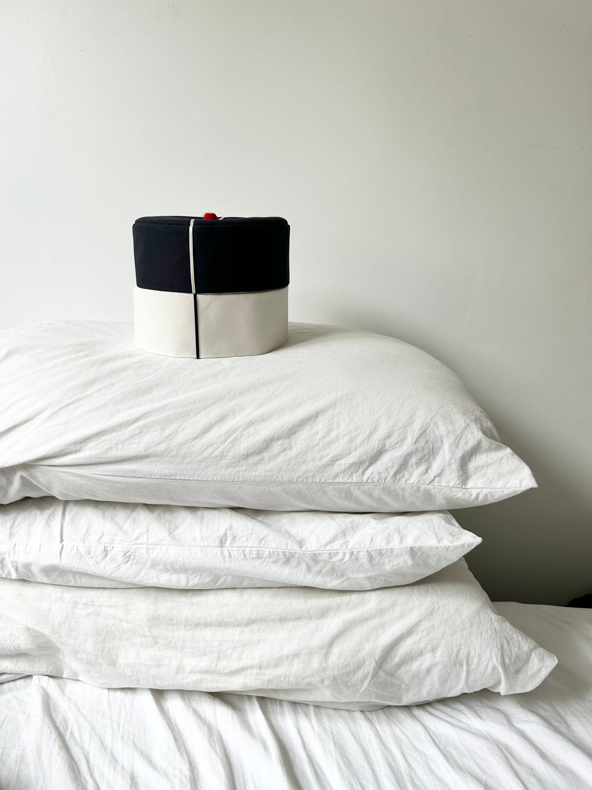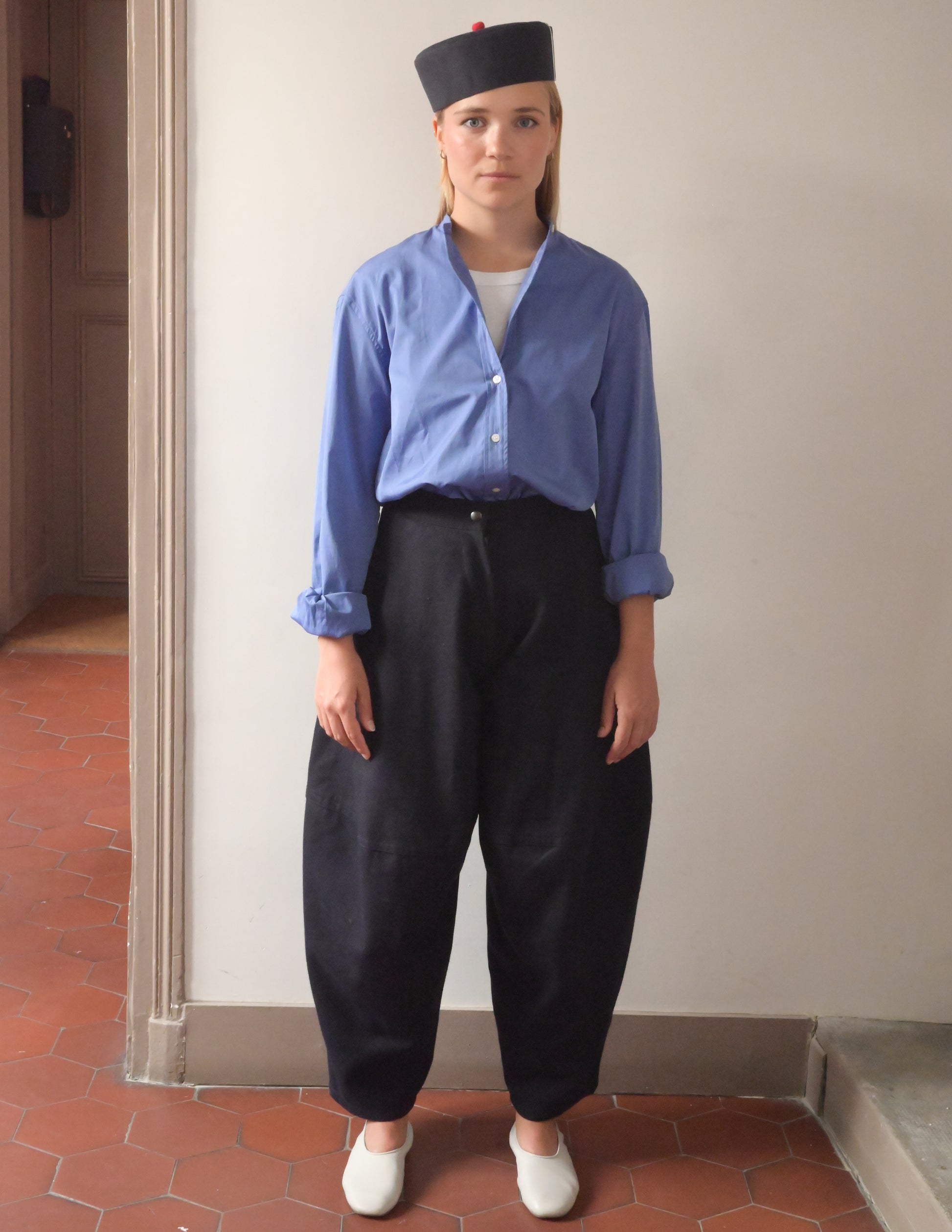 Ce chapeau se porte sur le dessus de la tête. Ici, nous aimons le porter légèrement incliné sur le côté.