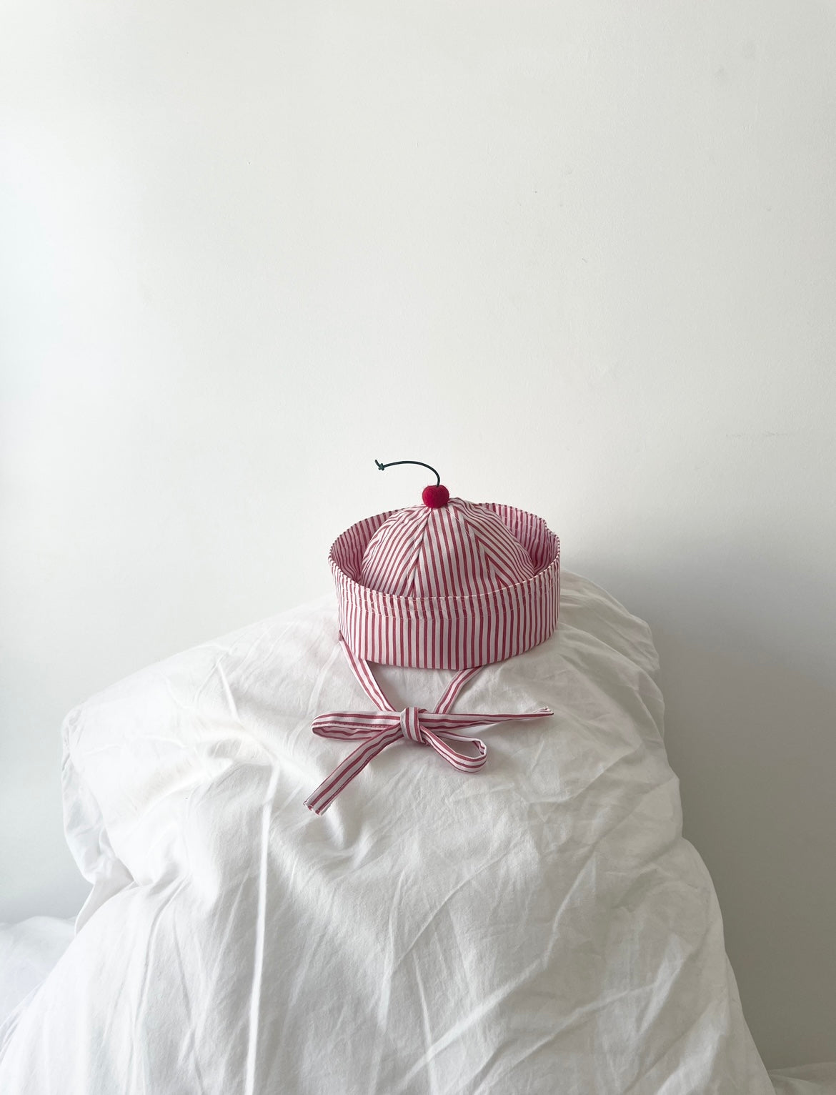 Chapeau marin à rayures rouges et blanches avec cerise en feutrine sur le dessus.